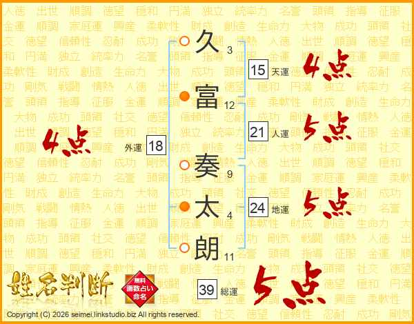 久富奏太朗さんの総運は39画の5点!