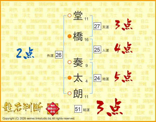 堂(11画)橋(16画) 奏(9画)太(4画)朗(11画)