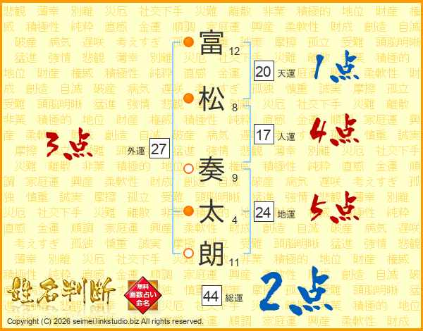 富(12画)松(8画) 奏(9画)太(4画)朗(11画)