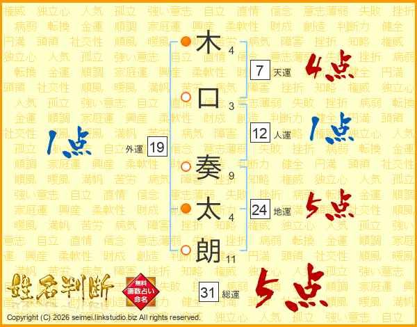 木(4画)口(3画) 奏(9画)太(4画)朗(11画)