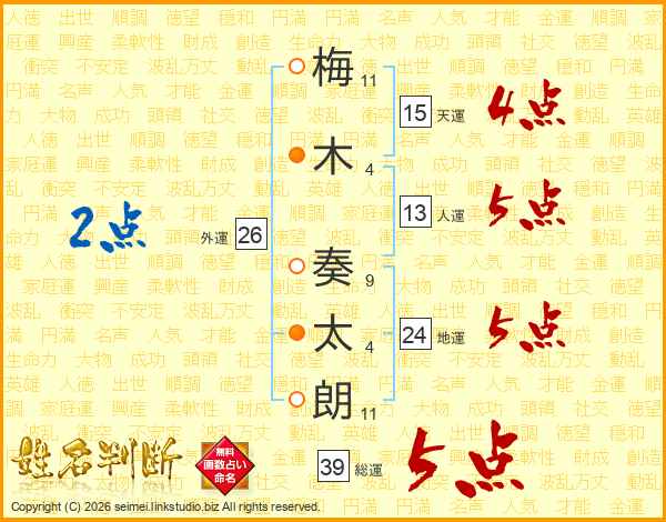 梅(11画)木(4画) 奏(9画)太(4画)朗(11画)