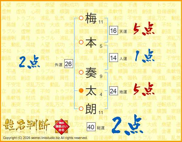 梅(11画)本(5画) 奏(9画)太(4画)朗(11画)