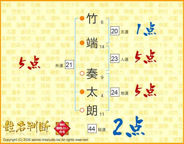 竹(6画)端(14画) 奏(9画)太(4画)朗(11画)