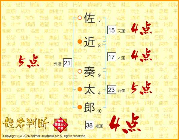 佐近奏太郎さんの総運は38画の4点!