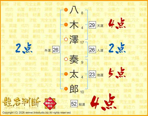 八木澤奏太郎さんの総運は52画の4点!