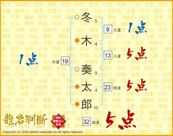 冬(5画)木(4画) 奏(9画)太(4画)郎(10画)