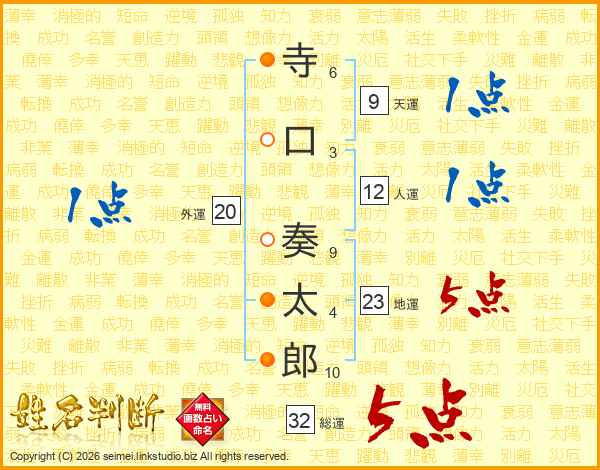 寺口奏太郎さんの総運は32画の5点!