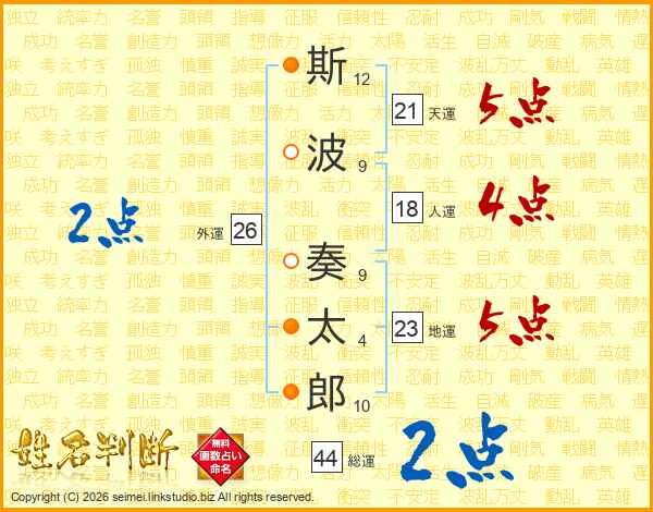斯(12画)波(9画) 奏(9画)太(4画)郎(10画)