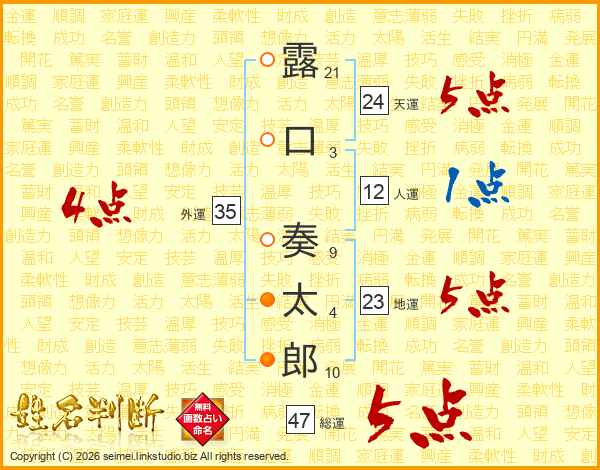 露(21画)口(3画) 奏(9画)太(4画)郎(10画)