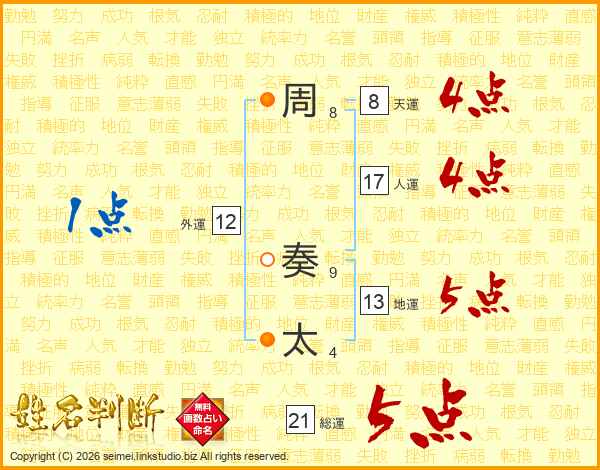 生活面を象徴する運勢です。外部から受ける影響力を表し、結婚運、家庭運や職場、環境への順応性を表します。総運から人運を引いた画数。姓や名が1文字の場合を除く。