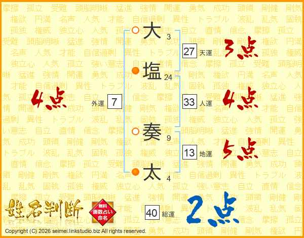生活面を象徴する運勢です。外部から受ける影響力を表し、結婚運、家庭運や職場、環境への順応性を表します。総運から人運を引いた画数。姓や名が1文字の場合を除く。