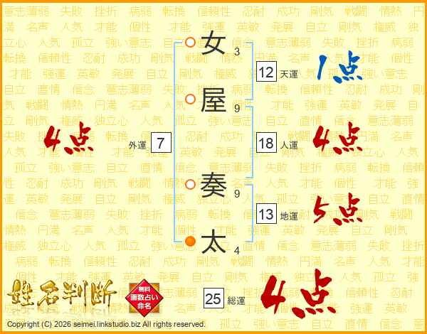 女屋奏太さんの総運は25画の4点!