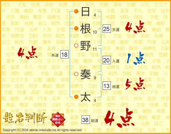 日(4画)根(10画)野(11画) 奏(9画)太(4画)