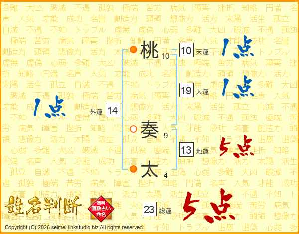 あなたの人生を表す1番重要な運勢です。生涯を通じて影響する総合運となり、主に50歳以降の晩年期に影響を及ぼします。苗字と名前の合計画数。