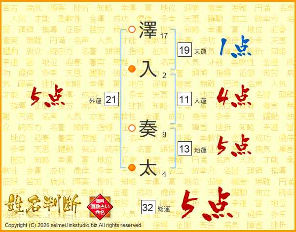 澤入奏太さんの総運は32画の5点!