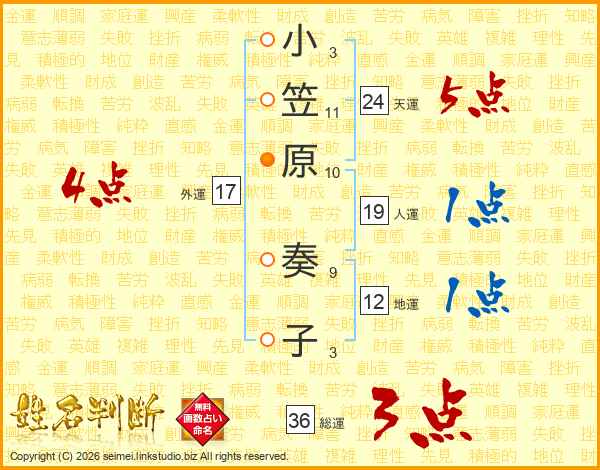 小笠原奏子さんの総運は36画の3点!