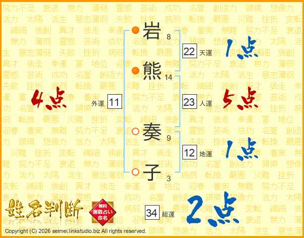 岩熊奏子さんの総運は34画の2点!