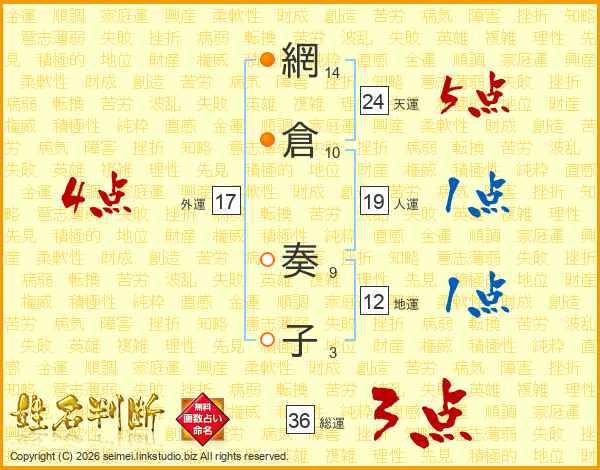 生活面を象徴する運勢です。外部から受ける影響力を表し、結婚運、家庭運や職場、環境への順応性を表します。総運から人運を引いた画数。姓や名が1文字の場合を除く。