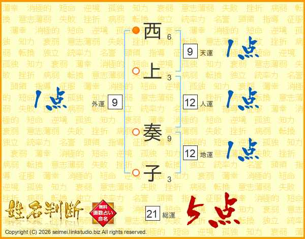 西上奏子さんの総運は21画の5点!