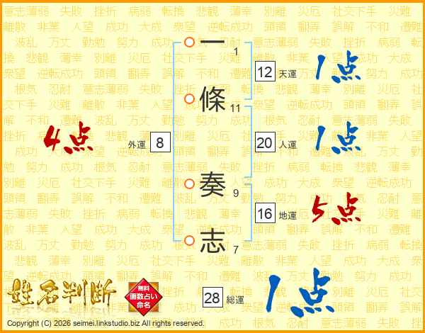 生活面を象徴する運勢です。外部から受ける影響力を表し、結婚運、家庭運や職場、環境への順応性を表します。総運から人運を引いた画数。姓や名が1文字の場合を除く。