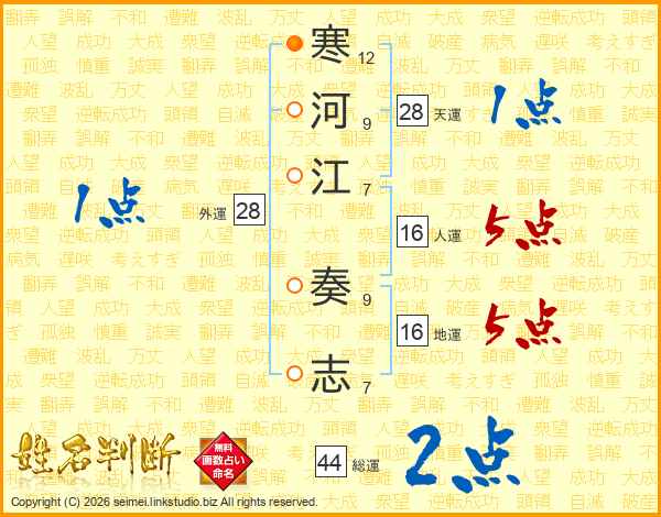 寒河江奏志さんの総運は44画の2点!