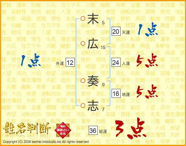 生活面を象徴する運勢です。外部から受ける影響力を表し、結婚運、家庭運や職場、環境への順応性を表します。総運から人運を引いた画数。姓や名が1文字の場合を除く。