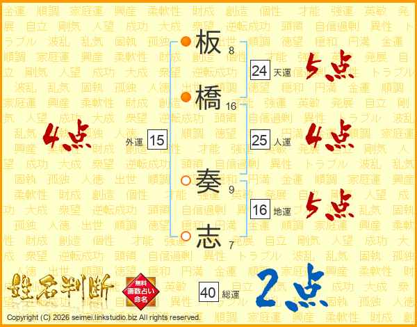 生活面を象徴する運勢です。外部から受ける影響力を表し、結婚運、家庭運や職場、環境への順応性を表します。総運から人運を引いた画数。姓や名が1文字の場合を除く。