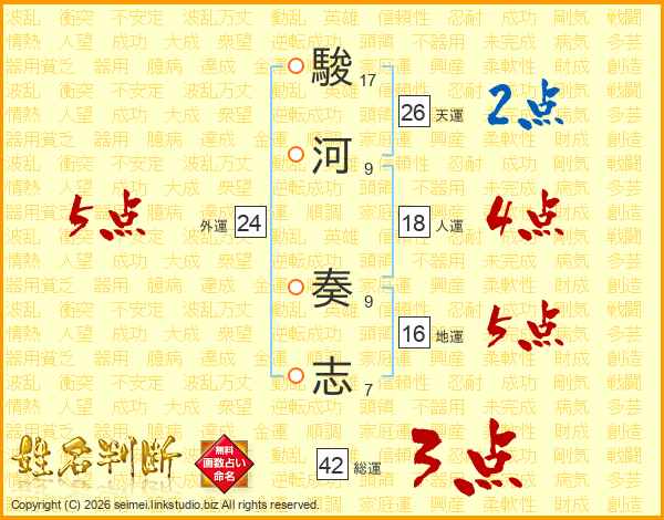 家系が持つ宿命的な運勢を表します。祖先から受け継いだ苗字ですので自分の力が及びません。家柄を象徴します。苗字の合計画数。