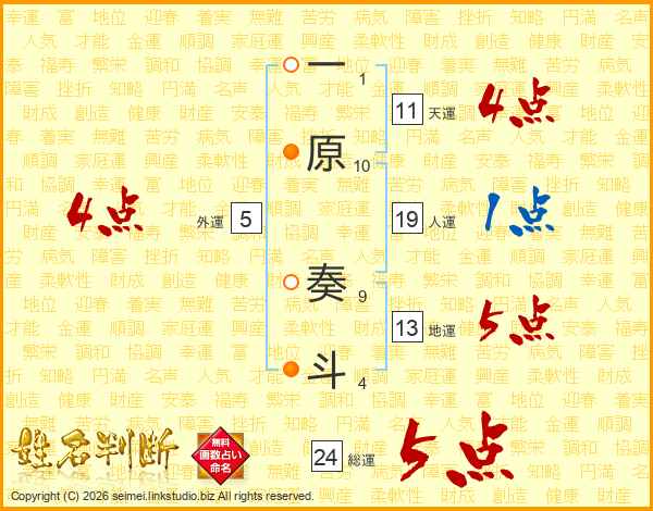 家系が持つ宿命的な運勢を表します。祖先から受け継いだ苗字ですので自分の力が及びません。家柄を象徴します。苗字の合計画数。