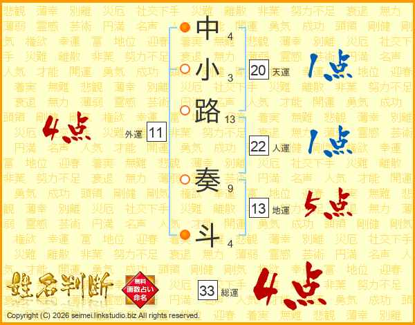 生活面を象徴する運勢です。外部から受ける影響力を表し、結婚運、家庭運や職場、環境への順応性を表します。総運から人運を引いた画数。姓や名が1文字の場合を除く。