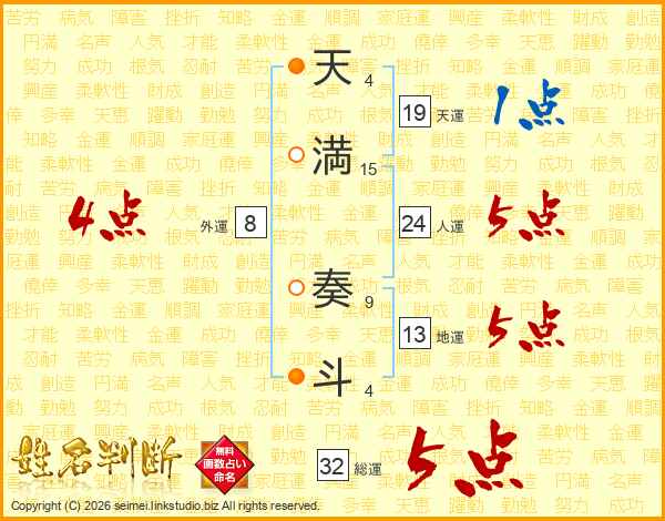 生活面を象徴する運勢です。外部から受ける影響力を表し、結婚運、家庭運や職場、環境への順応性を表します。総運から人運を引いた画数。姓や名が1文字の場合を除く。