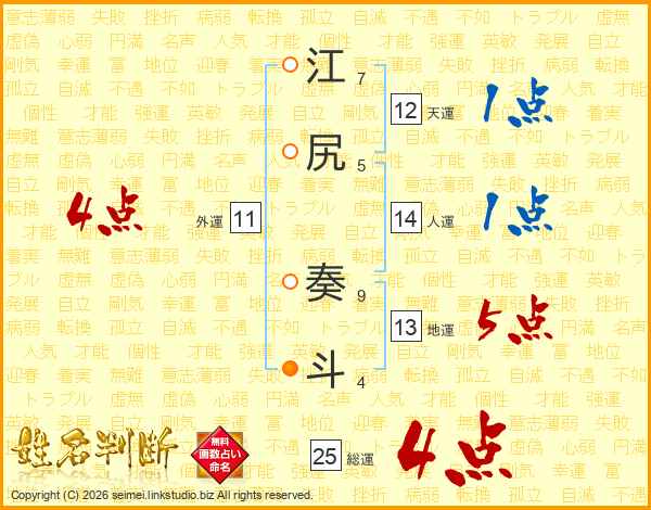 生活面を象徴する運勢です。外部から受ける影響力を表し、結婚運、家庭運や職場、環境への順応性を表します。総運から人運を引いた画数。姓や名が1文字の場合を除く。