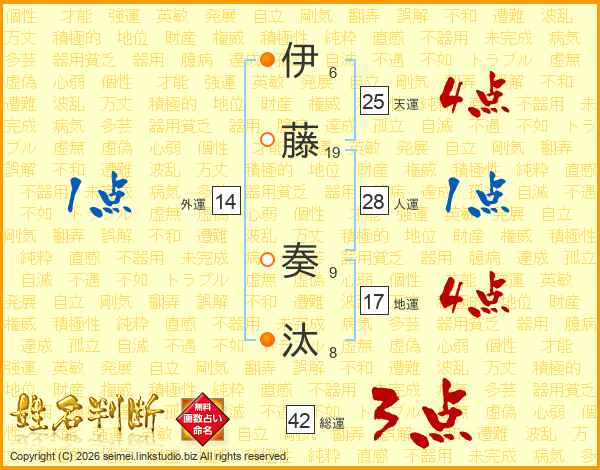 伊(6画)藤(19画) 奏(9画)汰(8画)