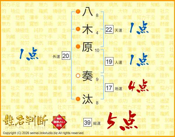八(8画)木(4画)原(10画) 奏(9画)汰(8画)