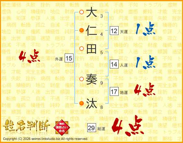 大(3画)仁(4画)田(5画) 奏(9画)汰(8画)