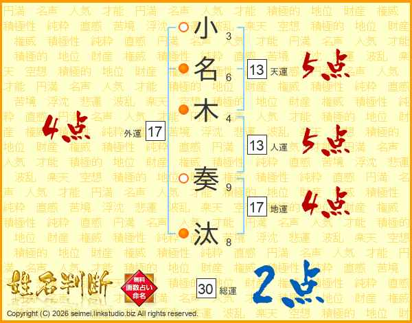 小(3画)名(6画)木(4画) 奏(9画)汰(8画)