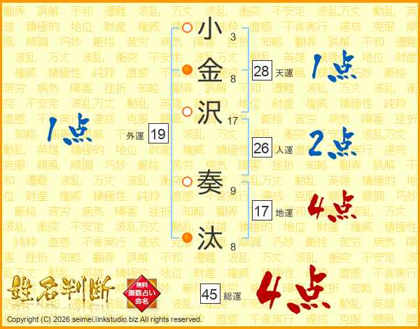 小(3画)金(8画)沢(17画) 奏(9画)汰(8画)