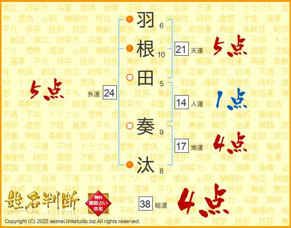 羽(6画)根(10画)田(5画) 奏(9画)汰(8画)
