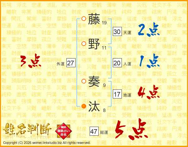 藤(19画)野(11画) 奏(9画)汰(8画)
