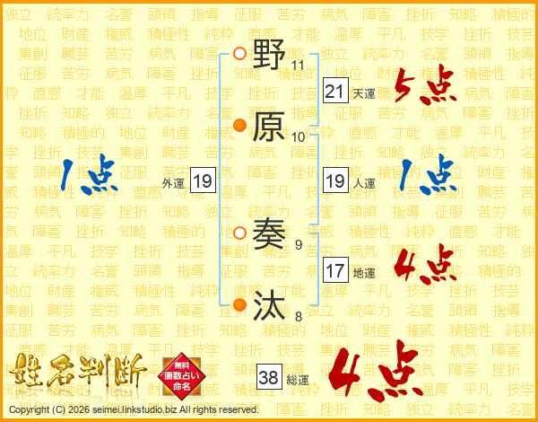 生活面を象徴する運勢です。外部から受ける影響力を表し、結婚運、家庭運や職場、環境への順応性を表します。総運から人運を引いた画数。姓や名が1文字の場合を除く。