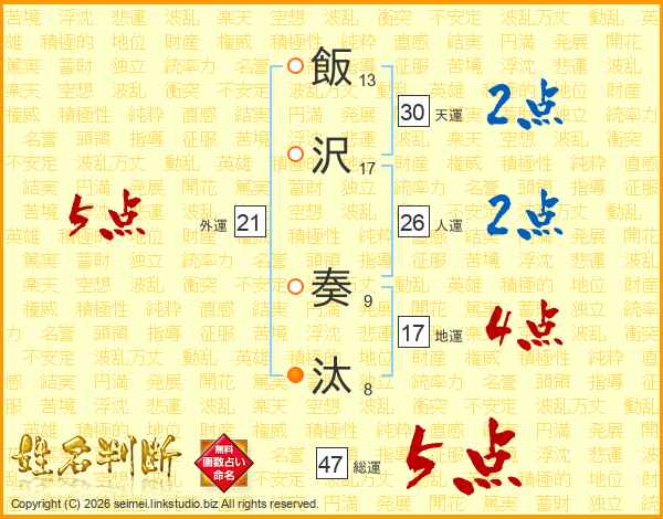 飯沢奏汰さんの総運は47画の5点!
