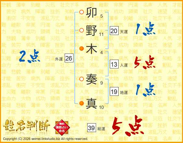 卯野木奏真さんの総運は39画の5点!