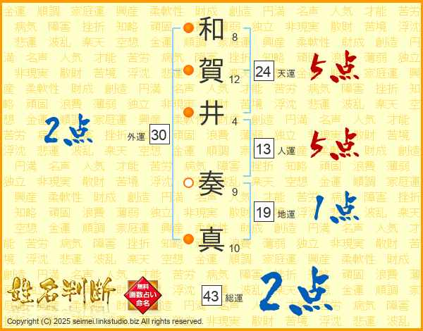 和(8画)賀(12画)井(4画) 奏(9画)真(10画)