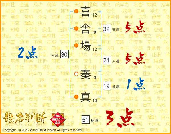 喜(12画)舎(8画)場(12画) 奏(9画)真(10画)