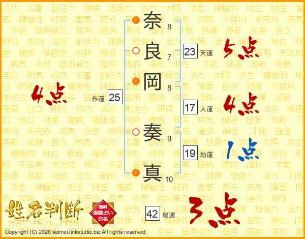 奈(8画)良(7画)岡(8画) 奏(9画)真(10画)