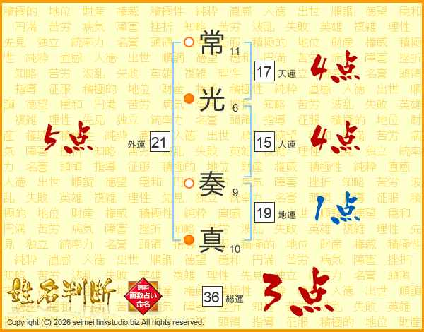 生活面を象徴する運勢です。外部から受ける影響力を表し、結婚運、家庭運や職場、環境への順応性を表します。総運から人運を引いた画数。姓や名が1文字の場合を除く。