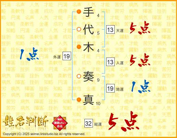 生活面を象徴する運勢です。外部から受ける影響力を表し、結婚運、家庭運や職場、環境への順応性を表します。総運から人運を引いた画数。姓や名が1文字の場合を除く。