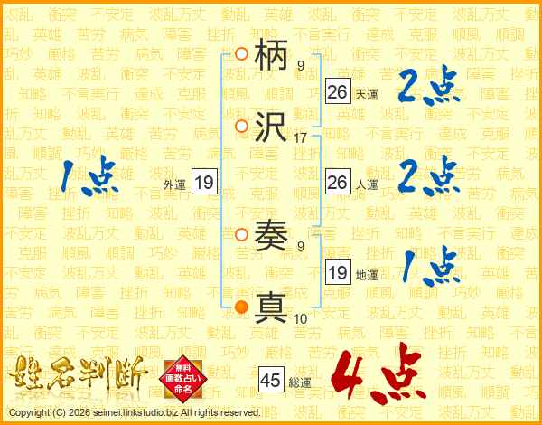 柄(9画)沢(17画) 奏(9画)真(10画)