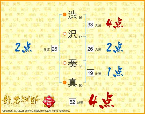 渋(16画)沢(17画) 奏(9画)真(10画)