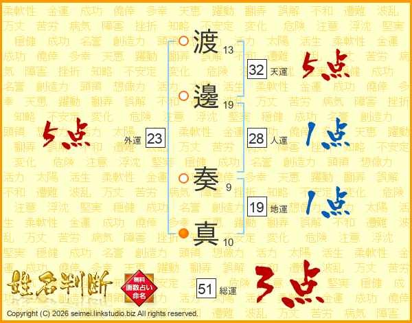 渡(13画)邊(19画) 奏(9画)真(10画)